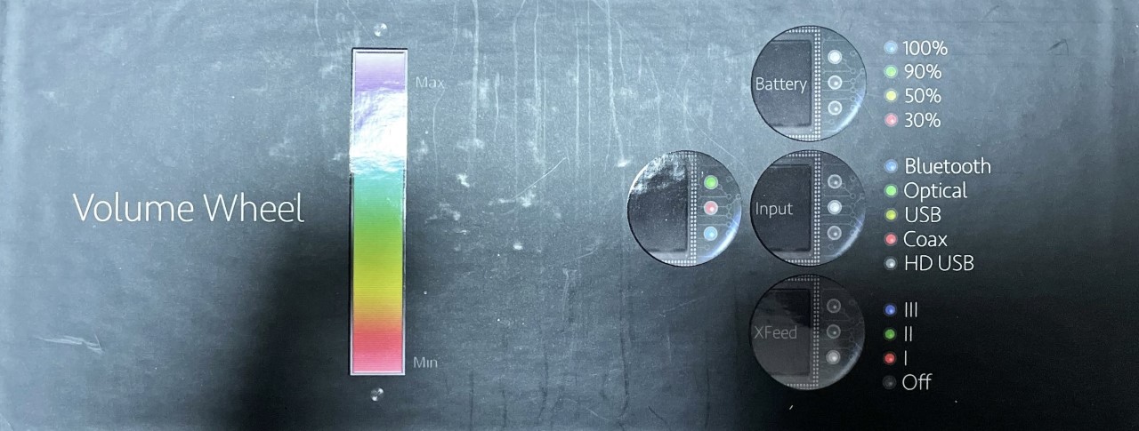 외부에서는 배터리 충전상태, 샘플링 레이트, 볼륨, 인풋, 크로스피드를 색깔을 통해 확인할 수있다.